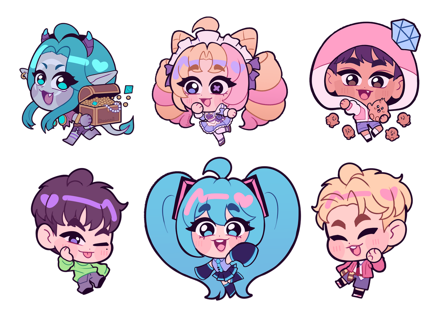 Simple background (white, color, decorations)Chibis detallados con colores planos